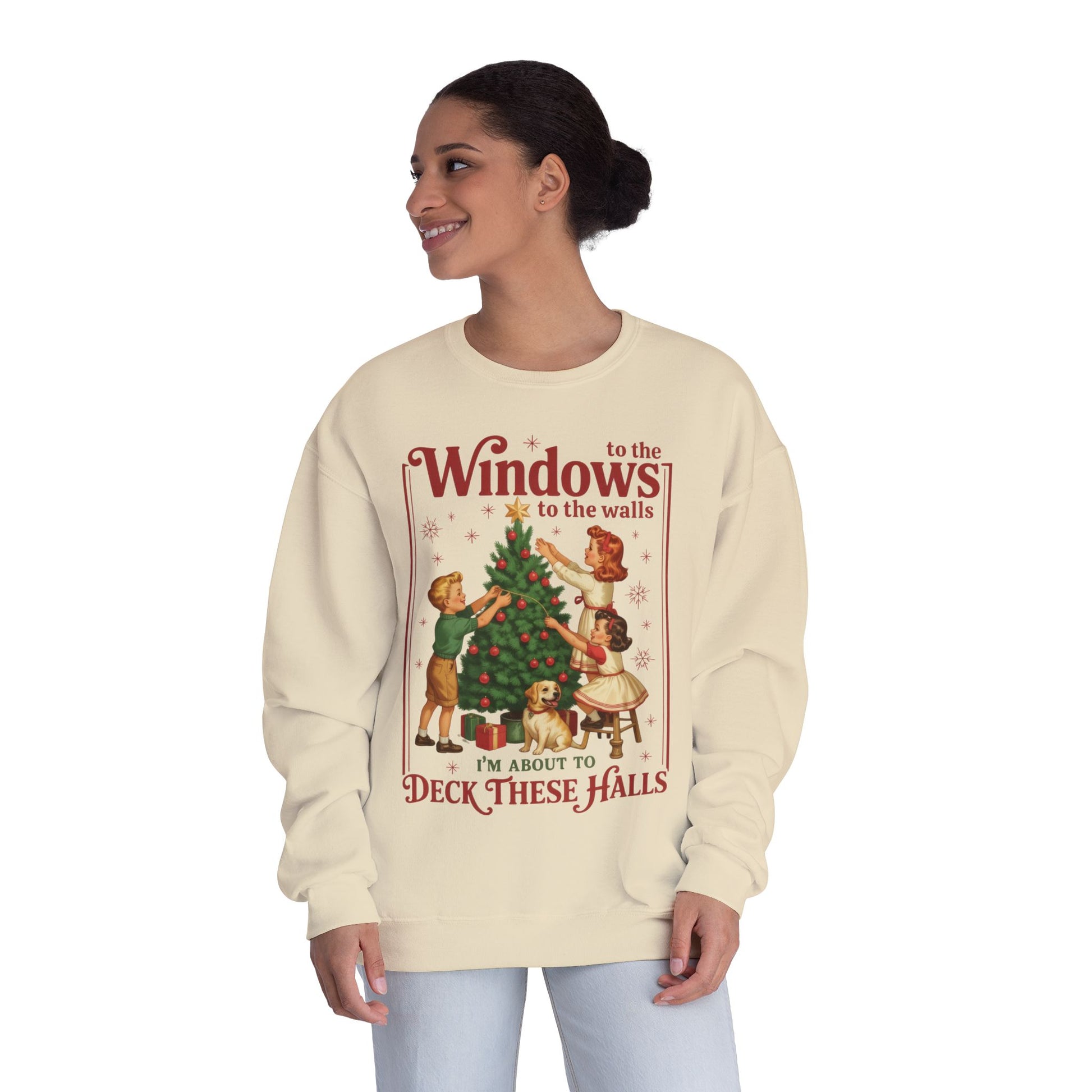 Holiday Crewneck Sweatshirt — "Deck These Halls" Vintage Christmas Tree Design